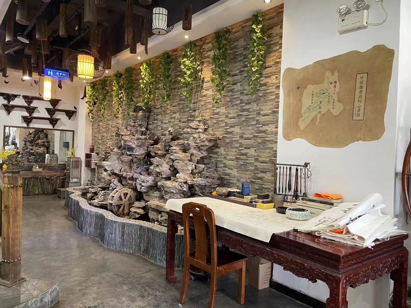 酒馆装修以中式风格为主,定位是酱酒认知品鉴的场所。大厅内设置会客区、品鉴区等,酒馆内悬挂有名家字画和中国人宴饮的传统经典画作。